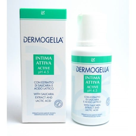 DERMOGELLA INTIMA ATTIVA pH 4.5 assicura igiene e protezione quotidiana, in tutte le situazioni a rischio di infezione, grazie alla sua formulazione a base di una miscela di tensioattivi delicati e di estratto naturale di Salicaria, con proprietà antibatteriche e astringenti.
