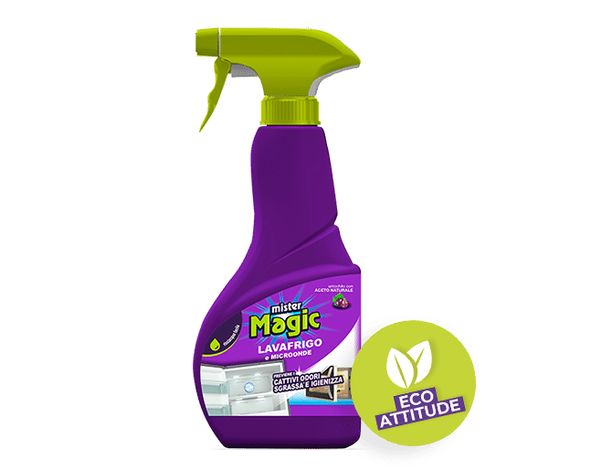 Scopri Lavafrigo e microonde Mister Magic®. Con lo stesso prodotto puoi pulire anche il microonde! Spruzzalo sulle superfici da trattare: è efficace per la pulizia profonda di frigorifero ed anche microonde.