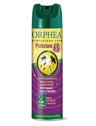 Orphea® Protezione Casa è un prodotto specifico, studiato e creato per proteggere da tutti gli insetti molesti in ambiente esterno e interno. Ha un’azione abbattente e residuale ed è in grado di creare un’efficace barriera persistente all’entrata degli insetti della durata di 8 ore per i volanti e di 3 settimane per gli striscianti. È indicato nella difesa contro le zanzare (compresa la zanzara tigre), pappataci, mosche e altri “invasori volanti occasionali”. La particolare formulazione permette inoltre di trattare le superfici normalmente frequentate dagli insetti striscianti (formiche, scarafaggi) in modo efficace e persistente attraverso il depositarsi di una schiuma acquosa che si dissolve velocemente, permettendo una potente azione abbattente e residuale. Orphea® Protezione Casa, quindi, può definirsi un trattamento per le superfici a lento e graduale rilascio che permette un’elevata protezione dagli insetti per tutta la durata del trattamento. Non macchia le superfici.